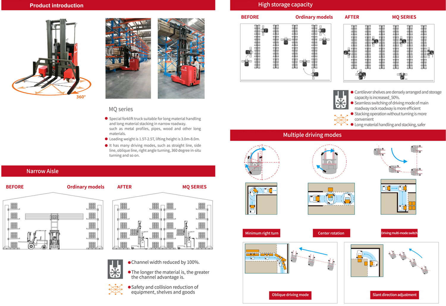 La carretilla retráctil multidireccional serie MQ se utiliza en pasillos muy estrechos para el manejo de materiales largos, la altura de elevación es de 3 a 8 m, tiene modelos de desplazamiento recto, desplazamiento lateral, desplazamiento oblicuo y rotación in situ, la mejor opción para perfiles de metal, varillas de refuerzo, madera, tubos de acero y otros.