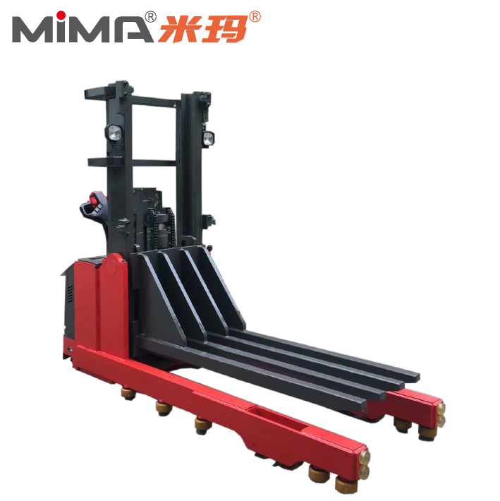 Apilador eléctrico personalizado/patas más anchas/altura de elevación más baja/2T Con diseño de patas más anchas, altura de elevación más baja, horquilla tipo forjado/tipo soldado; Adecuado para transporte y apilado de paletas de dos pisos;